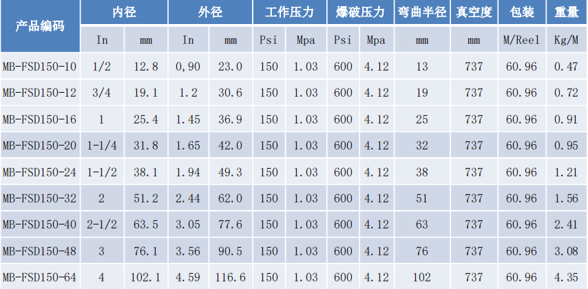 內徑 | 外徑 | 工作壓力 | 爆破壓力 | 彎曲半徑 | 包裝 | ||||
